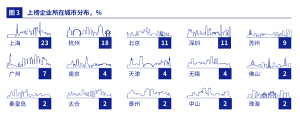 从城市来看,63%的上榜企业来自上海、杭州、 北京、深圳四地,是上榜企业的主要麇集城市。其中共23家上榜企业来自上海,位列城市第一; 杭州上榜企业18家,深圳和北京各11家,位列城市的第二至四位。与此同期,苏州、广州等城市也在不休发力,从政策维持、专科人才培养、生物科技产业园斥地等上风继续发力以招引更多的优质生物科技企业入驻。从地域漫衍来看,50强榜单上的总共企业都位于长三角、粤港澳和京津冀三大城市群中,其中位于长三角城市群的企业占比达61%,浮现出以上海为龙头的长三角地区正成为国内生物科技公司的麇集高地。