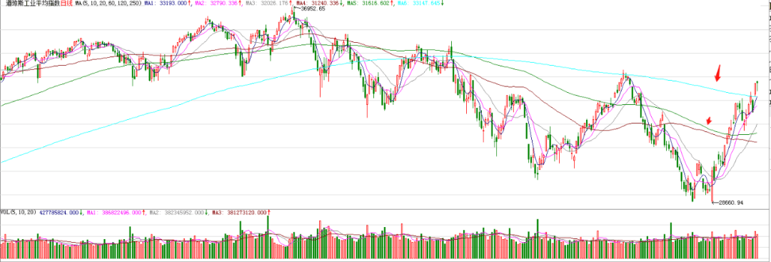 今天,也顺路分析一下美国的大盘指数。最近,道琼斯工业平均指数涨幅比拟大。纳斯达克指数和尺度普尔500指数这两天也走出了可以的高潮,这一切成绩于美国cpi指数低于预期,美联储锐利加息的可能性下降。然而,现时美国三个大盘指数也濒临着紧要时刻面开发,就是中永恒均线,开发难度大。除非能络续强势高潮,否则很难在短期内完成开发。因此,尽管还有高潮的动能,道琼斯指数为代表的美国大盘指数不要多久,很可能濒临着再次下落的可能。